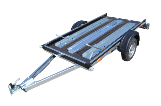 Single-axle platform with ramp for 2 motorcycles – 524 kg payload, waterproof floor and 6 lashing rings for secure transport.